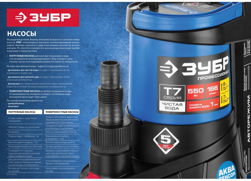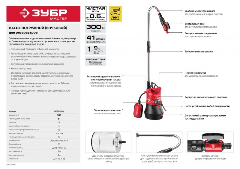 Дренажный насос для резервуаров Зубр НПБ-300 300 Вт