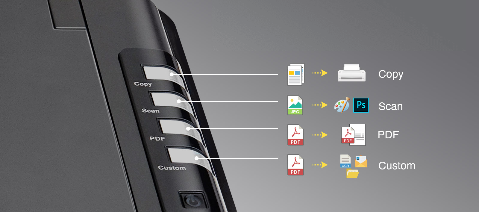 | Кнопки управления | Copy, Scan, PDF, Custom |