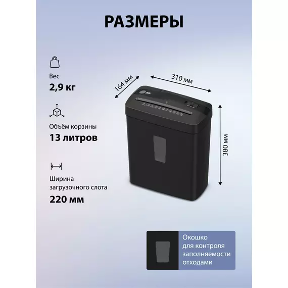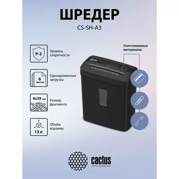 Шредер Cactus CS-SH-A3 (секр.P-4) фрагменты 6.лист. 13лтр. скобы пл.карты