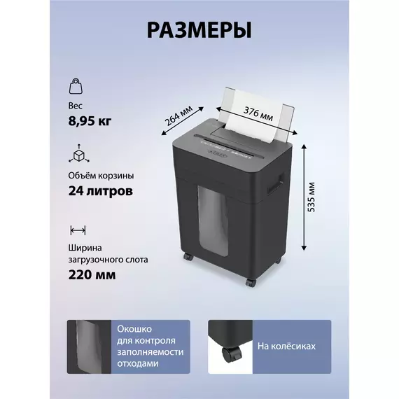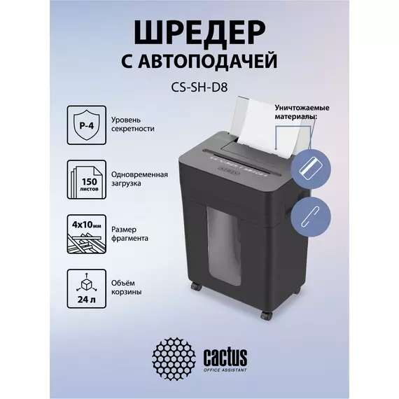 Шредер Cactus CS-SH-D8 с автоподачей (секр.P-4) фрагменты 150лист. 24лтр. скобы пл.карты