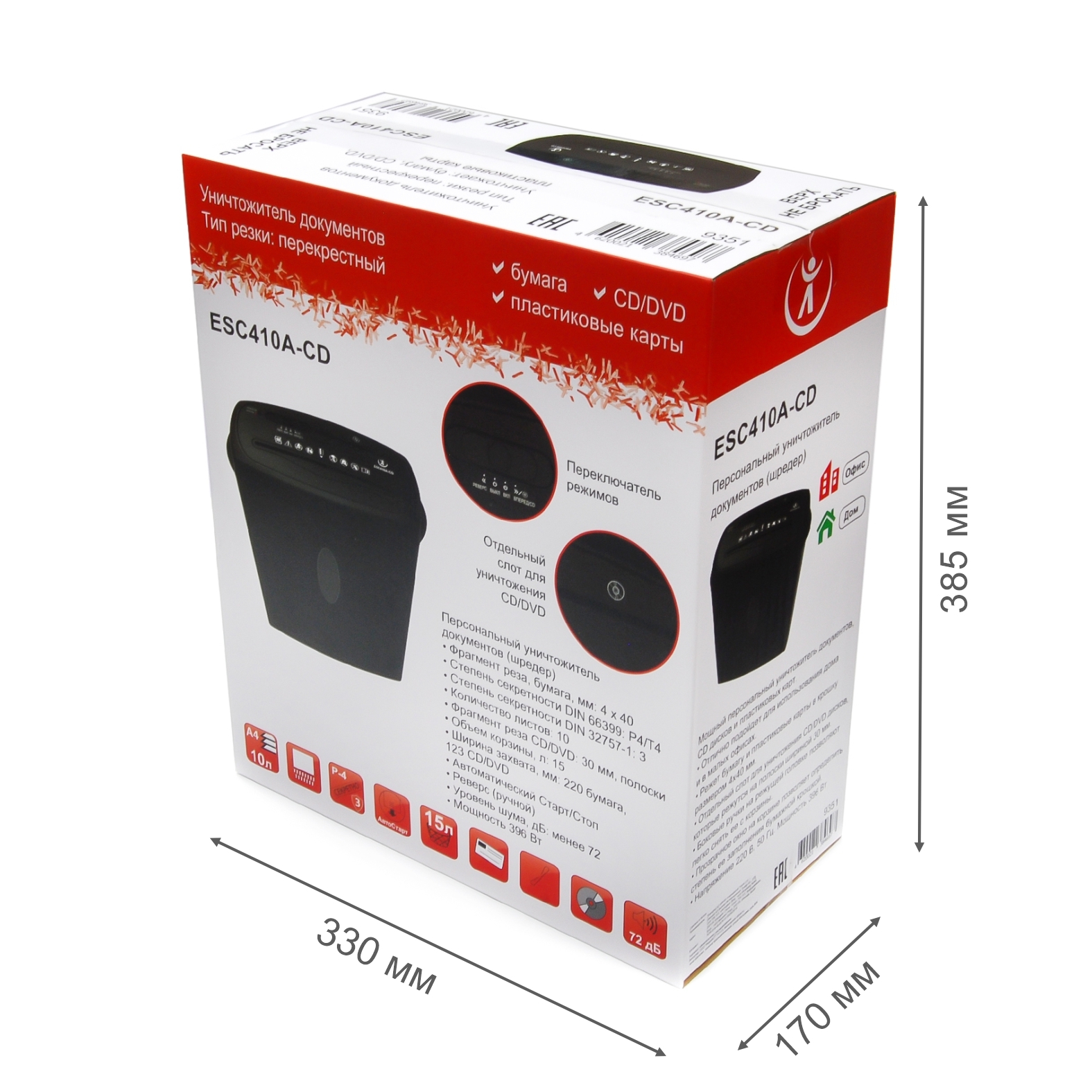 | Дополнительные характеристики | - цвет: черная корзина / черный верх; - уничтожает кредитные карты, CD/DVD, степлерные скобы; - автоматический старт/стоп; - реверс (ручной); - смотровое окошко в корзине |