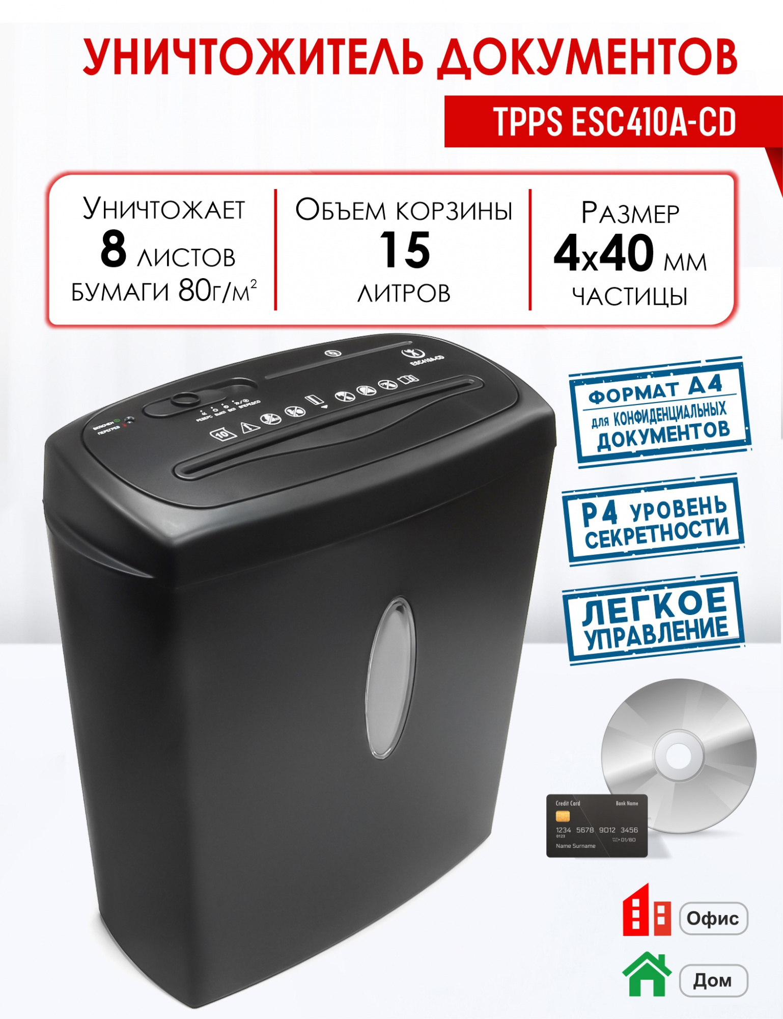 Уничтожитель документов TPPS ESC410A-CD 4x40мм, 8лст, CD1, 15л, P4
