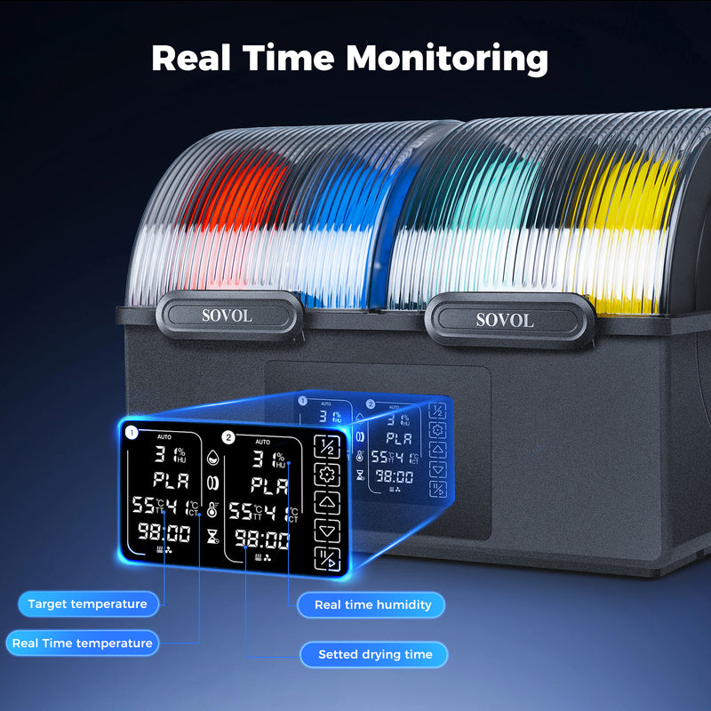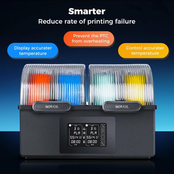 Сушилка филамента Sovol SH03 — это инновационное устройство, предназначенное для эффективной сушки и хранения 3D-филамента перед использованием в принтерах. Устройство оснащено двумя независимыми камерами нагрева, что позволяет одновременно сушить и хранить филамент, предотвращая его увлажнение и сохраняя оптимальные свойства. Благодаря нагревательным элементам PTC мощностью 200 Вт + 200 Вт, сушилка быстро и равномерно нагревает пространство до 85 °C, а система автоматического осушения устраняет скопление влаги, что критически важно для качественной печати. Устройство поддерживает одновременную сушку до четырёх катушек по 1 кг и оснащено модернизированными выходами для нити, что делает его универсальным решением для 3D-энтузиастов и профессионалов.