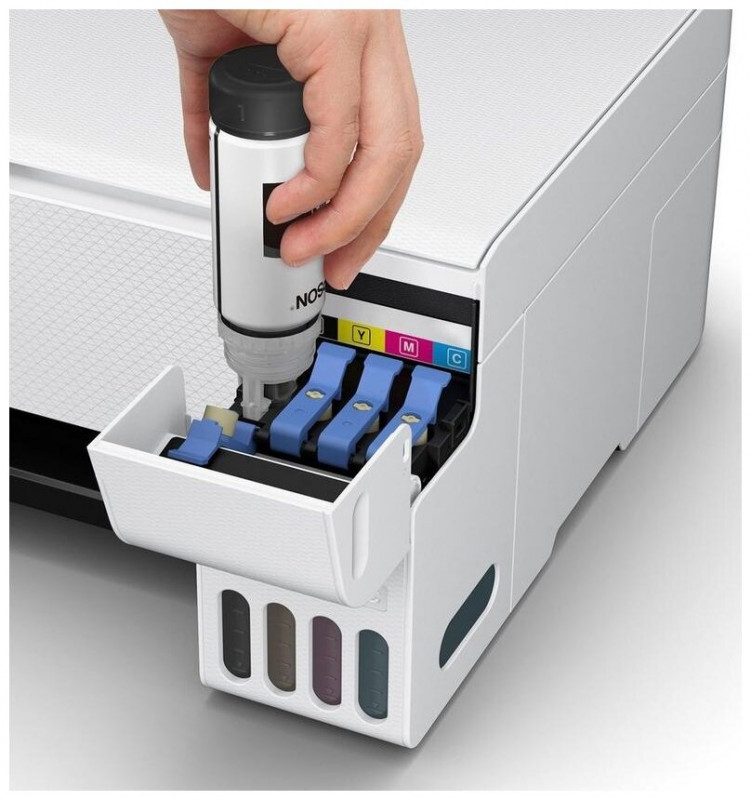 - Фронтальные емкости для чернил: Да; позволяют легко контролировать уровень чернил и удобно заправлять чернильные контейнеры