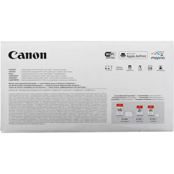 | Режимы печати | Прямая печать с камеры, прямая печать с карт памяти SD/SDHC, прямая печать с совместимых устройств iOS и Android через Wi-Fi и приложение SELPHY Photo Layout, печать с компьютера (Windows, Mac OS, IPP Everywhere) |