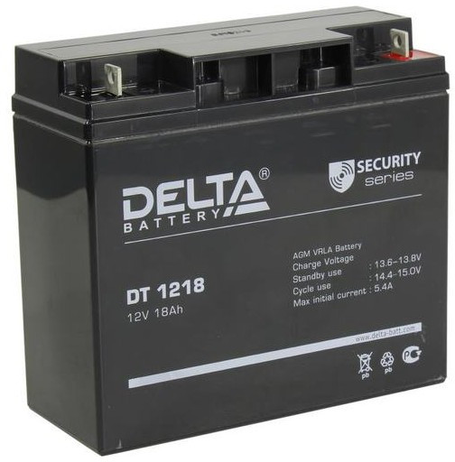 - Герметизированный VRLA cвинцово-кислотный аккумулятор Delta DT 1218 напряжением 12В и емкостью 18Ач изготовлен по технологии AGM (с микропористым заполнителем, пропитанным электролитом)