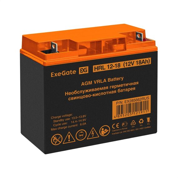 Аккумулятор Exegate HRL 12-18 12V, 18Ah, клеммы F3, болт М5 с гайкой [EX285662RUS]