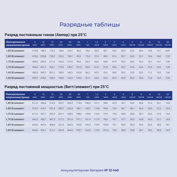 | Саморазрядка | Аккумулятор хранить максимум в течение 6 месяцев при температуре 25 C, после чего необходим подзаряд. При более высоких температурах период времени будет сокращен. |