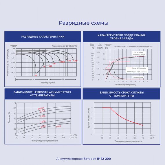| Циклический режим | Начальный ток заряда менее 2,70 А. Напряжение 14,4 В~15,0 В при 25 C. Температурный коэффициент - 20 мВ/ C |