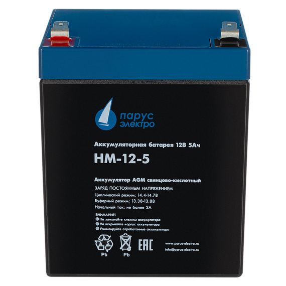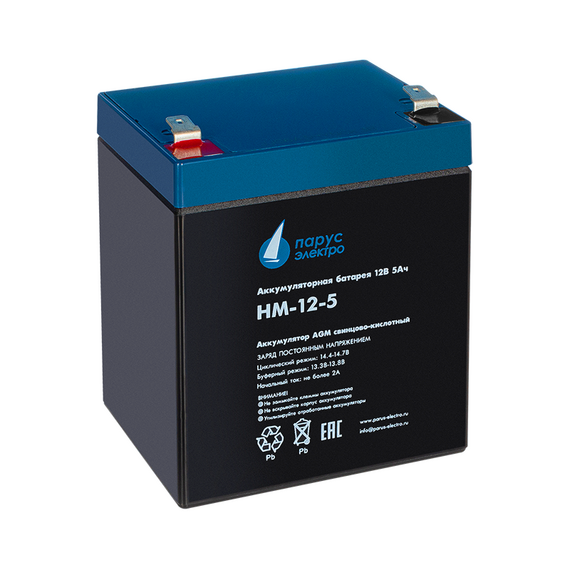 Батарея Парус электро HM-12-5 12В, 5Ач (разряд 20 часов), макс. ток разряда (5сек) 75А, макс. ток заряда 2А, свинцово-кислотная типа AGM, клеммы F2, 90х70х101мм
