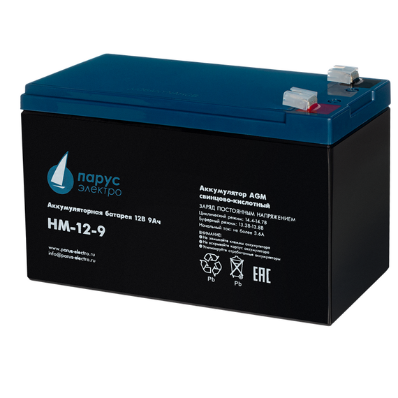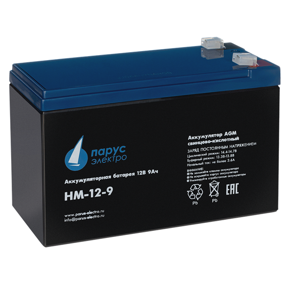 Батарея Парус электро HM-12-9 12В, 9Ач (разряд 20 часов), макс. ток разряда (5сек) 135А, макс. ток заряда 3.6А, свинцово-кислотная типа AGM, клеммы F2, 151х65х94мм