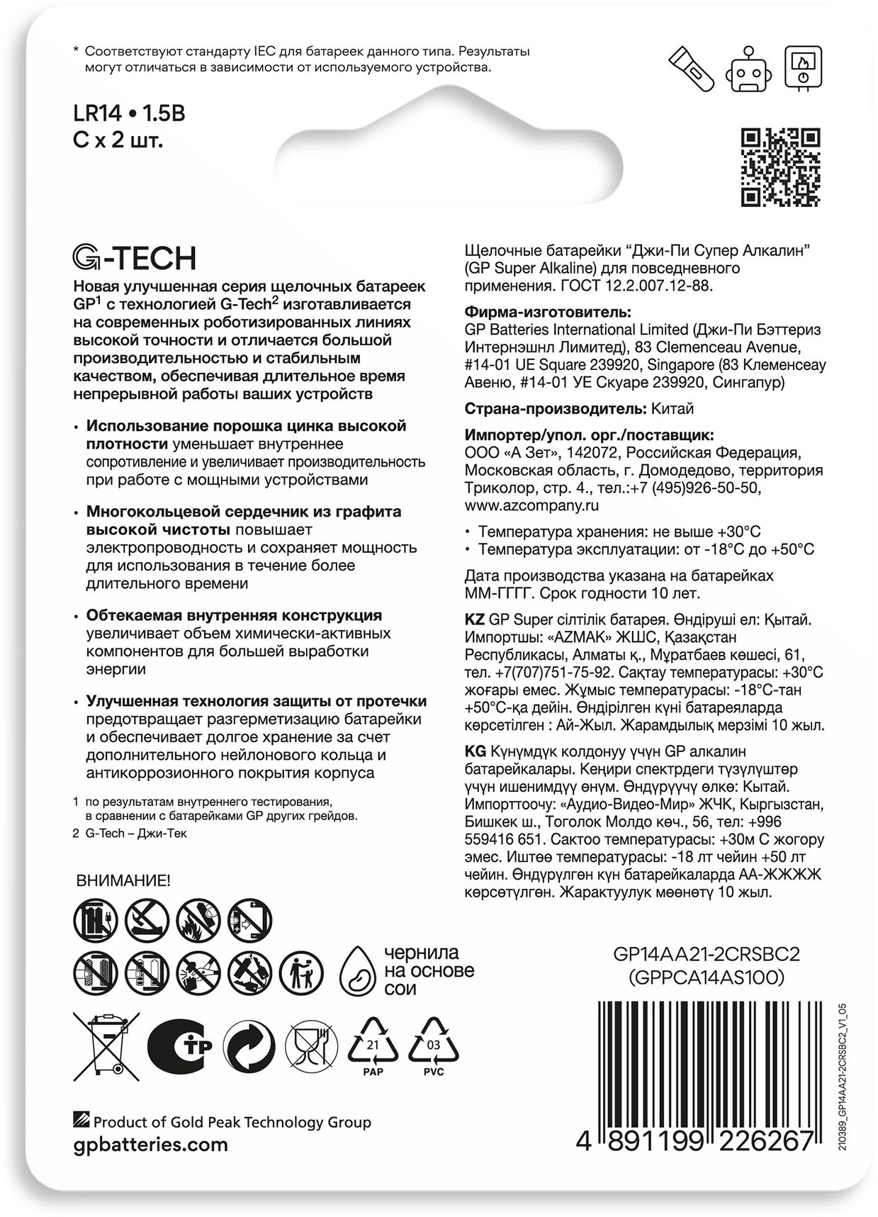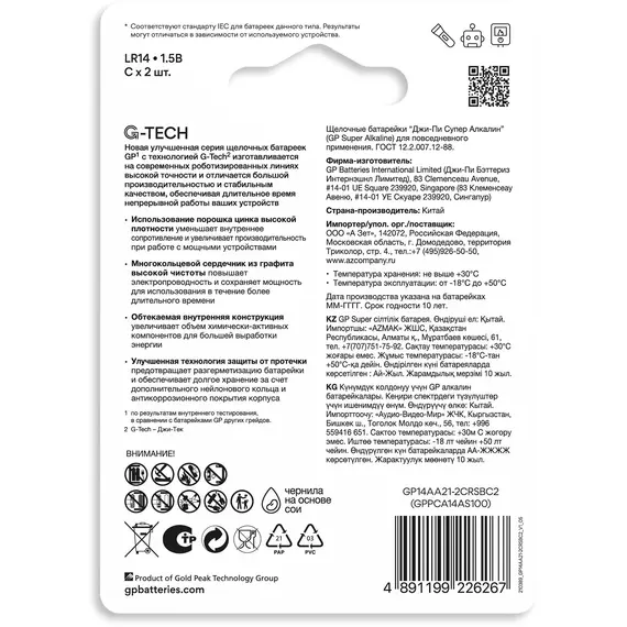 Батарея GP 14AA21-2CRSBC2 Super G-Tech Alkaline 14A LR14 C 2шт блистер