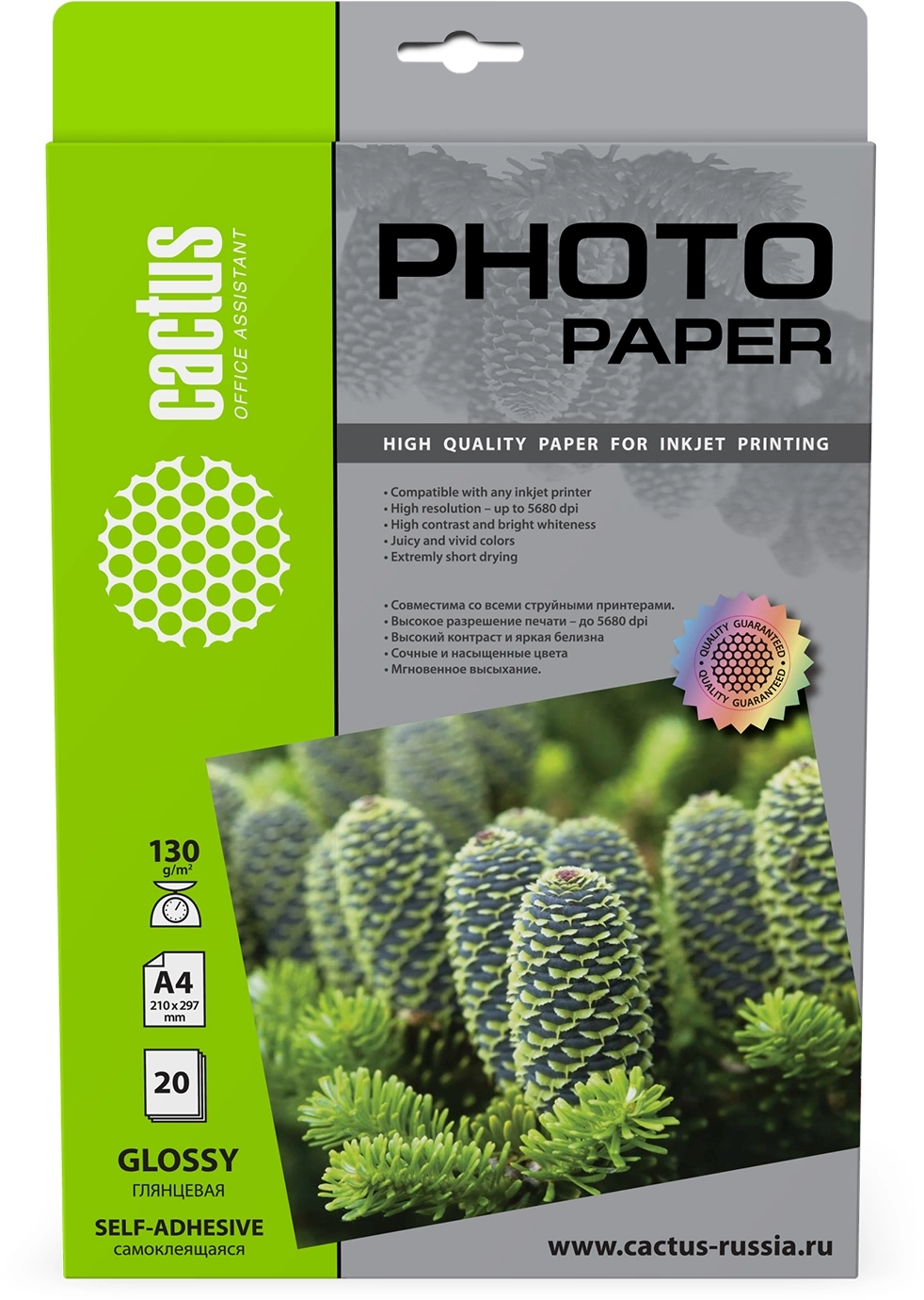 Фотобумага Cactus CS-GSA413020 A4 130г/м2 20л глянцевое самоклей для струйной печати
