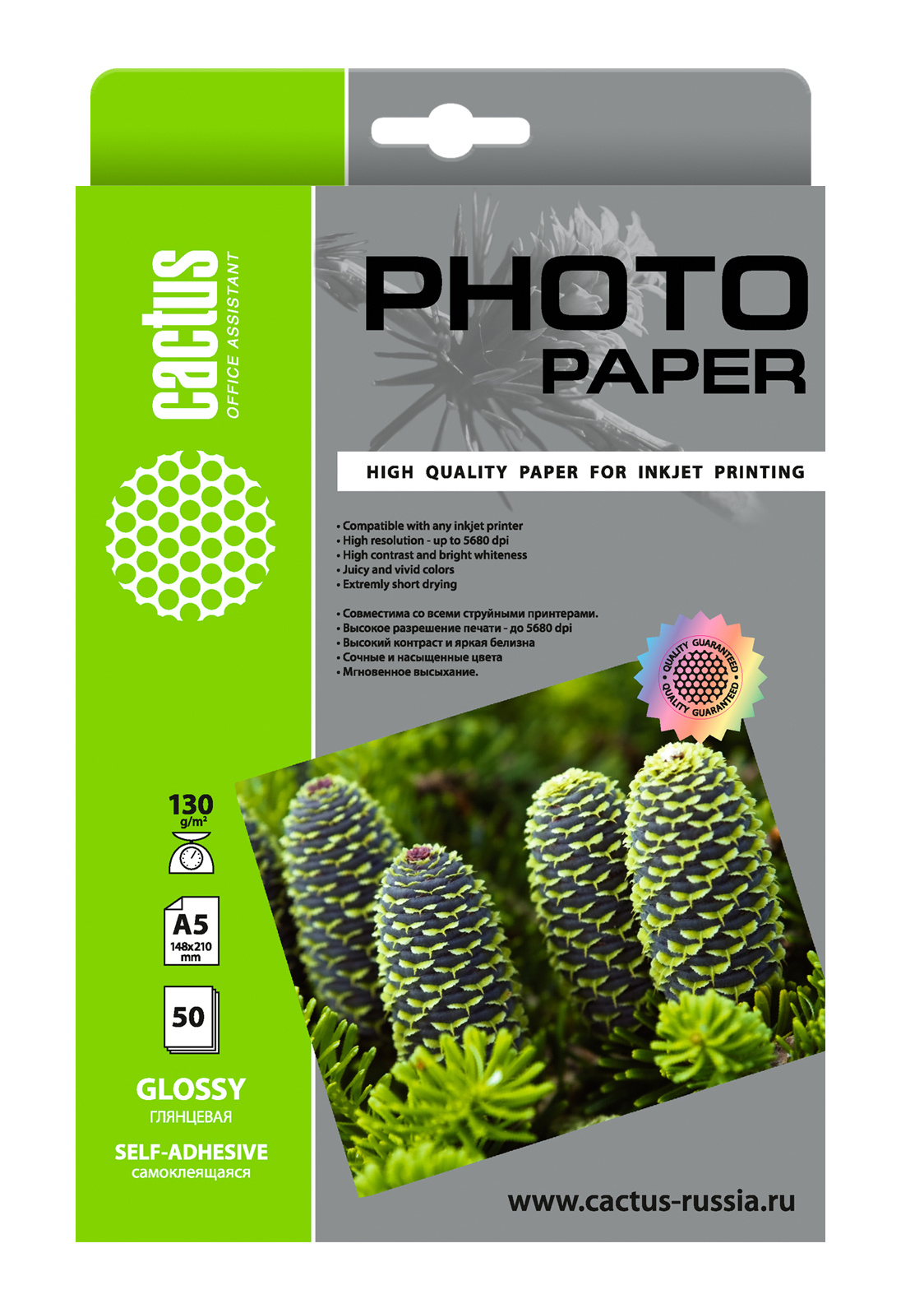 Фотобумага Cactus CS-GSA513050 A5, 130г/м2, 50л, глянцевое, самоклей, для струйной печати