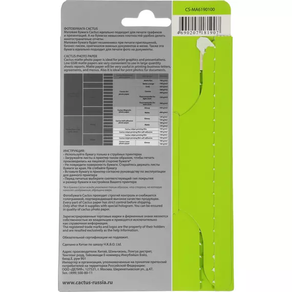 Фотобумага Cactus CS-MA6190100 10x15/190г/м2/белый/100л матовое для струйной печати
