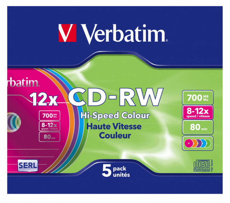Диск Verbatim CD-RW 700Mb 12x Slim case 5шт Color [43167]