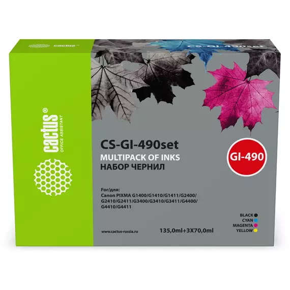 Чернила Cactus CS-GI-490SET голубой/пурпурный/желтый/черный набор для Canon PIXMA G1400/G1410/G1411/G2400/ G2410/G2411/G3400/G3410/G3411/ G4400/G4410/G4411