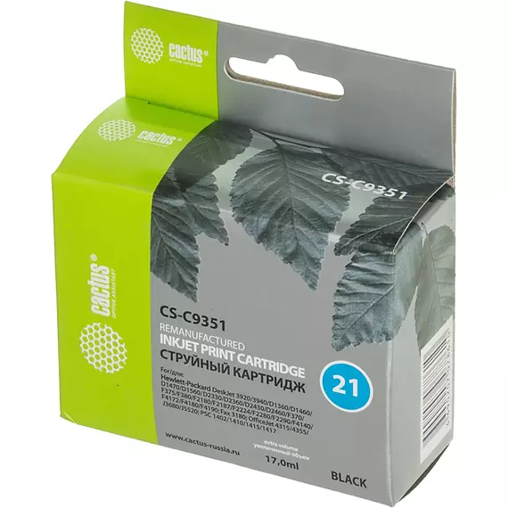 Картридж струйный Cactus CS-C9351 №21 черный 17мл для DJ 3920/3940/D1360/D1460/D1470/D1560/D2330/D2360/D2430/D2460/F370/F375/F380/F2180/F2187/F2224/F2280/F2290/F4140/F4172/F4180/F4190 с чипом [CS-C9351]