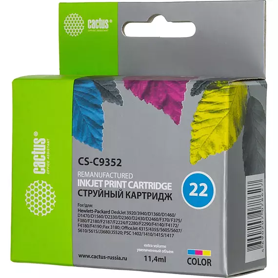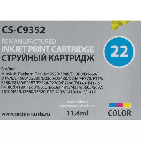 Картридж струйный Cactus CS-C9352 №22 многоцветный 11.4мл для DJ 3920/3940/D1360/D1460/D1470/D1560/D2330/D2360/D2430/D2460/F370/F375/F380/F2180/F2187/F2224/F2280/F2290/F4140/F4172/F4180/F4190 с чипом