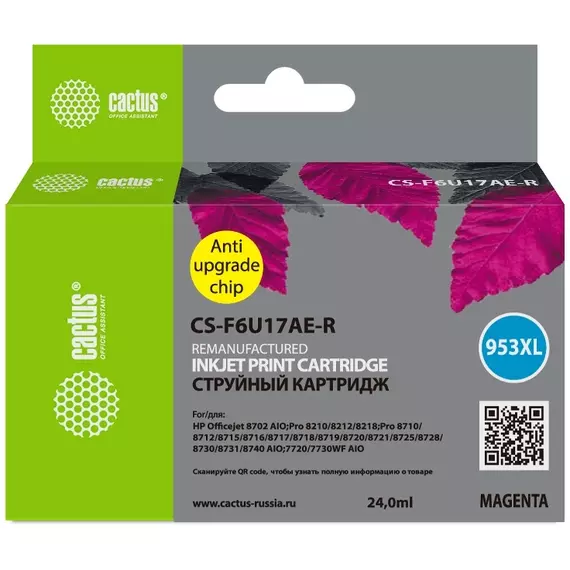 Картридж струйный Cactus CS-F6U17AE-R 953XL пурпурный 24мл для HP OJ Pro 7740/8210/8218/8710/8715 с чипом [CS-F6U17AE-R]