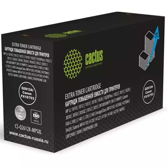 Картридж лазерный Cactus CS-Q2612X-MPSXL Q2612A/Canon FX10/703 черный (8000 стр.) для HP LJ 1010/1012/1015/1018/1020/1020Plus/1022/3015/3020/3030/3050/3050Z/3052/3055/M1005MFP/M1319MFP; Canon FAX-L100/L140/L120/L160, imageClass MF4150/4350d/4370dn/D420, Satera MF4110/4120/4122/4130/4140/4270/4690/LBP2900/3000, FAXPHONE L90