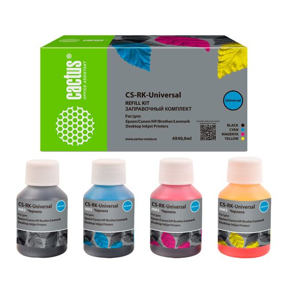 Заправочный набор Cactus CS-RK-UNIVERSAL голубой/пурпурный/желтый/черный набор 4x40мл для HP/Lexmark/Canon