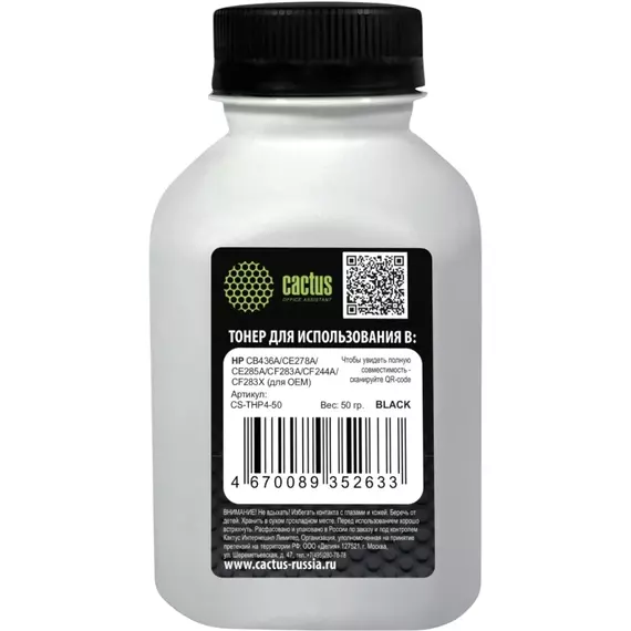 Тонер Cactus CS-THP4-50 черный флакон 50гр, для принтера CB436A, CE278A, CE285A, CF283A, CF244A, CF283X, для OEM, LJ P1005, P1006, Pro P1505, P1566, P1606, P1102, M1522, M1536, M1132, M1212, M1214, M1217, M125, M127, M201, M225, M15, M28