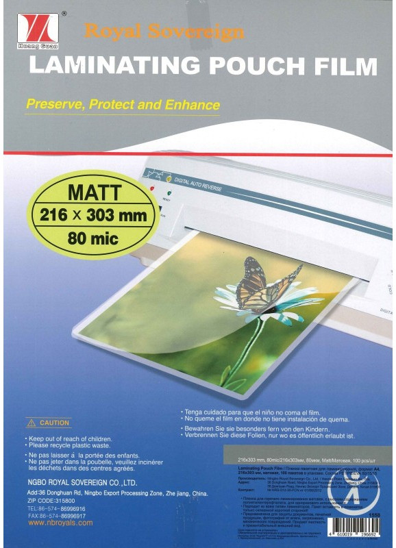 Матовая пакетная пленка для ламинирования от компании Royal Sovereign - это не полуматовая а именно качественная матовая пленка, на которой легко делать пометки карандашом или шариковой ручкой. Это матовая пленка, которая после ламинирования не придает серый оттенок изображению.
