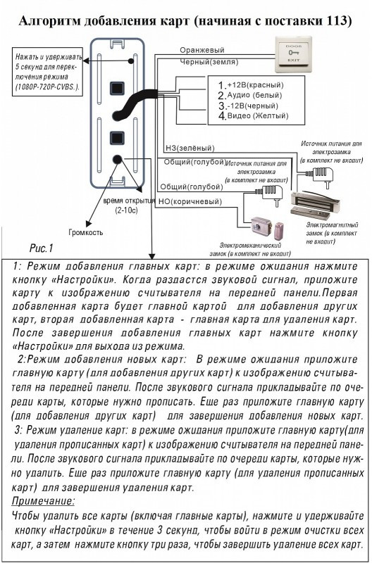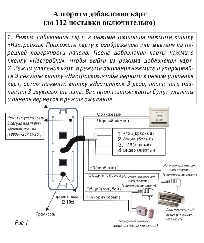 - Вызывная панель видеодомофона c кабелем для подключения к монитору и замку,козырек,кронштейн для поворота панели на 30°,монтажная пластина,IC карта-4шт.,монтажный комплект для крепления на стену,паспорт,тарная упаковка