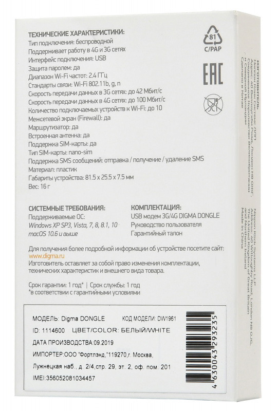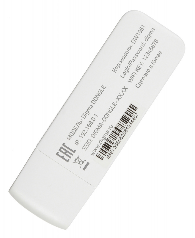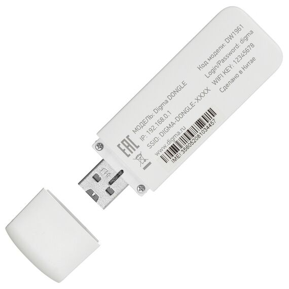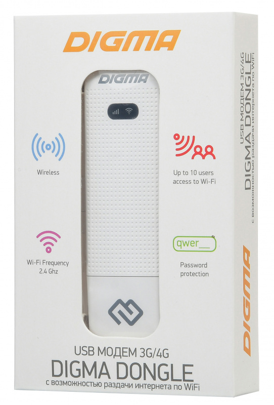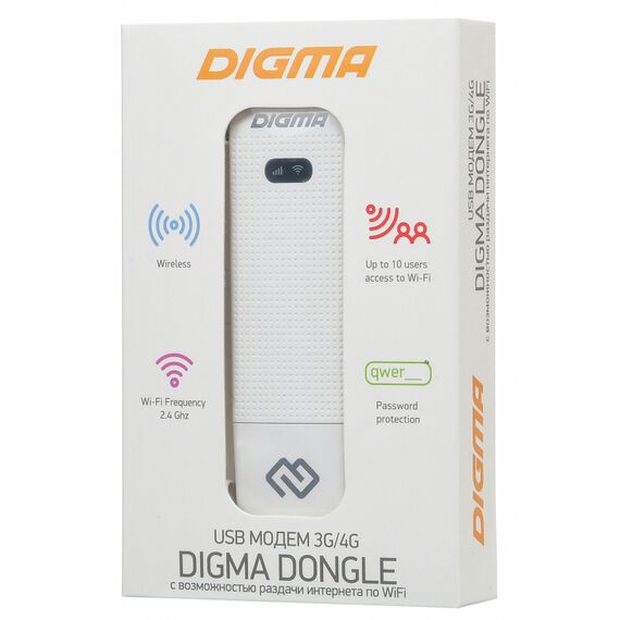 USB модем 3G/4G Digma Dongle DW1961 с интегрированным Wi-Fi роутером – универсальный инструмент для подключения к Интернету по сети сотовой связи ПК, ноутбуков, планшетов, онлайн-камер и иных устройств. Модем может получать питание как непосредственно через USB-порт гаджета, так и от пауэрбанка или сетевого адаптера.
