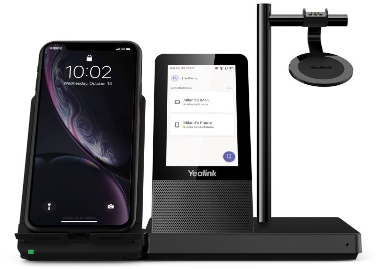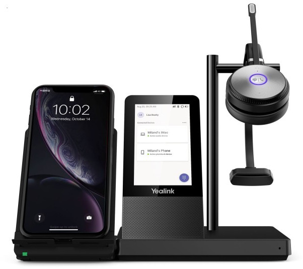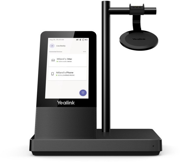 - Базовая станция гарнитуры обладает сенсорным дисплеем 4'' с разрешением 480x800 пикселей, встроенным спикерфоном, беспроводной зарядной подставкой для смартфона (опционально).
