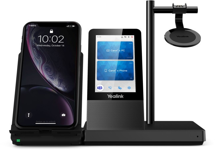 - Базовая станция гарнитуры обладает сенсорным дисплеем 4'' с разрешением 480x800 пикселей, встроенным спикерфоном, беспроводной зарядной подставкой для смартфона (опционально).