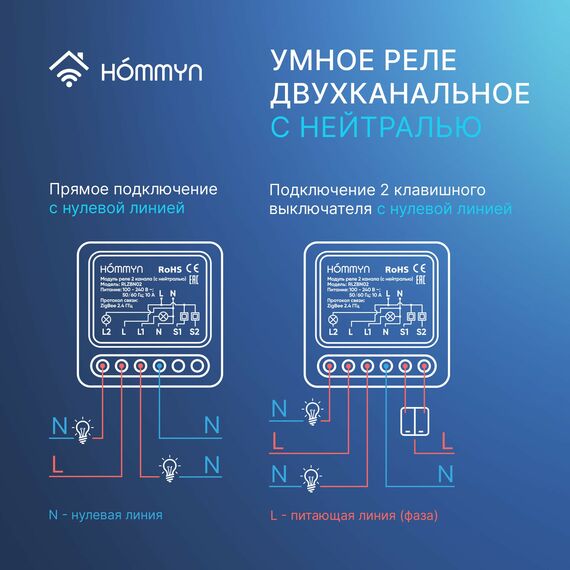 Двухканальное умное реле позволяет «прокачать» ваши любимые домашние «неумные» двухклавишный выключатель или розетку, делая их умными, не меняя их оригинальные функции и внешний вид. Компактный размер реле позволяет провести его монтаж в стандартный круглый подрозетник, спрятав его в стене за выключателем или розеткой. Для подключения требуется питающая линия L (фаза) и нулевая линия N (нейтраль). Умное реле позволяет не только управлять включением и выключением освещения или прибором с кнопки выключателя или прибора, но также добавляет возможность удаленного управления через приложение или с помощью голосовых помощников Алиса и Маруся. Реле работает с приложением Hommyn, для подключения требуется Zigbee хаб Hommyn. Реле подключается напрямую к станциям Алиса от Яндекс с Zigbee и работает в приложении Умный Дом с Алисой.