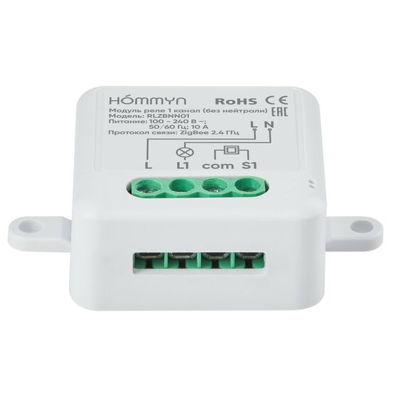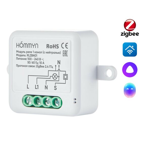 Для подключения необходимо только линия L (фаза), нулевая линия N (нейтраль) не требуется. Умное реле обеспечивает управление освещением или подключенными приборами как с помощью старого выключателя, так и через мобильное приложение или голосовых помощников Алиса и Маруся. Реле совместимо с приложением Hommyn и требует наличие Zigbee хаба Hommyn для подключения.