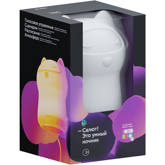 Умный ночник Sber в форме кошки красиво светится в темноте и стильно выглядит. Ваши дети будут просыпаться в удовольствие. Регулируйте яркость, температуру цвета, выбирайте любой из 16 млн цветов. Удалённо включайте ночник со смартфона и выключайте по таймеру.