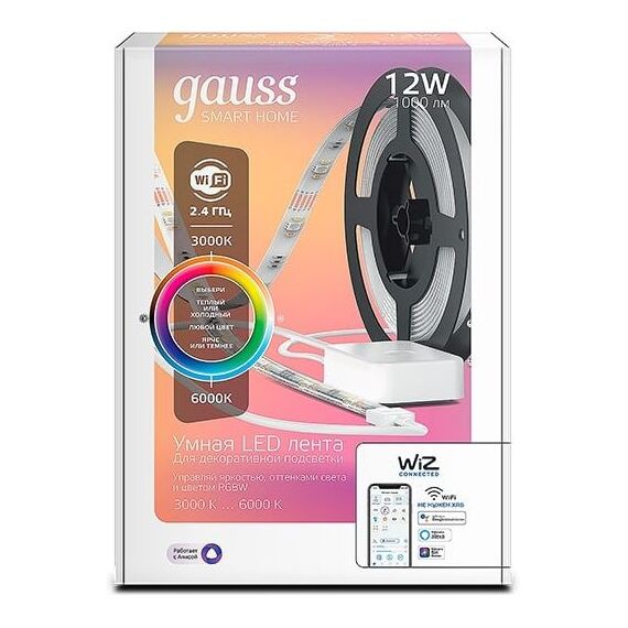 Умная Wi-fi светодиодная лента Gauss Smart Light RGBW 3м, 2700-6500K, диммируемая с изменением цвета, управление голосом/смартфоном
