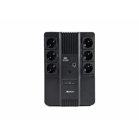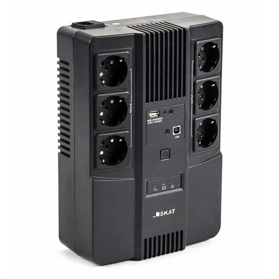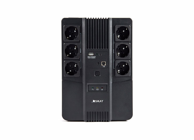 Источник оснащён 6 розетками (с поддержкой и без поддержки резервной работы), выходом USB для зарядки мобильных устройств и портами RJ-45 для защиты локальной сети — всё что нужно для безопасной работы компьютерной техники. Удобное крепление на стену позволяет удобно разместить SKAT-UPS 800 AI не занимая лишнего пространства на рабочем месте.