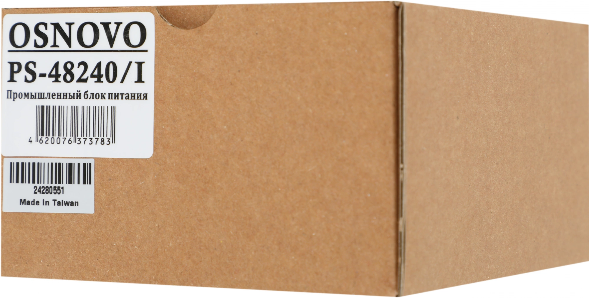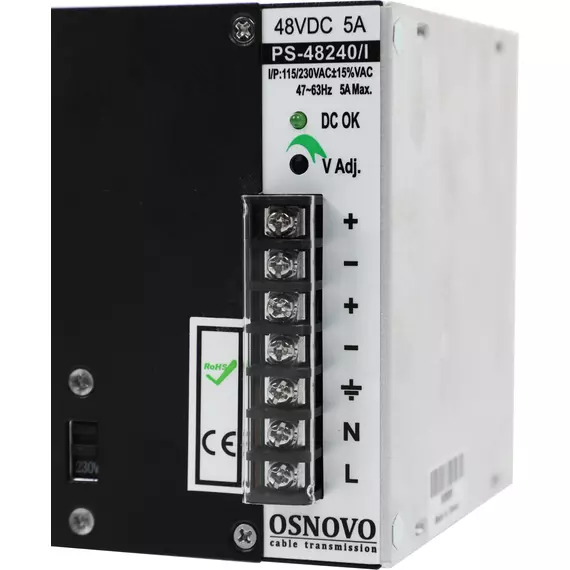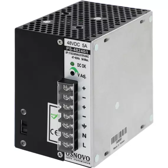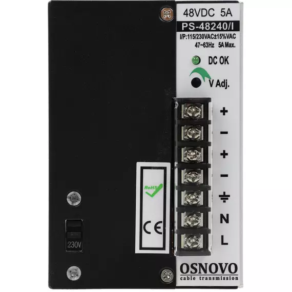 Промышленный блок питания. DC48V, 5A (240W). Входное напряжение AC195-265V. КПД: 84%. Регулировка выходного напряжения в диапазоне 45-53V. Защита от короткого замыкания, перенапряжения и перегрузки. Принудительная система охлаждения (вентилятор). Монтаж на DIN-рейку или стену.