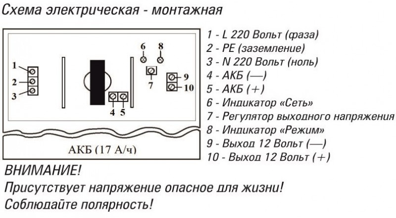 - Источник питания, крепеж, кабель с двумя клеммами для подключения внешнего АКБ, переходник для подключения АКБ 17 А/ч, паспорт, коробка.