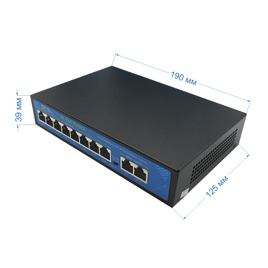 Источник питания ST ST-S85POE (2M/120W/А) PRO (версия 4) Switch POE 8-ми портовый, 48В, защита от КЗ, Extend 250м., AI PoE, AI VLAN, Грозозащита, PoE порты: 8 х (10/100 Мбит/с), UpLink порты: 2 х (10/100 Мбит/с)